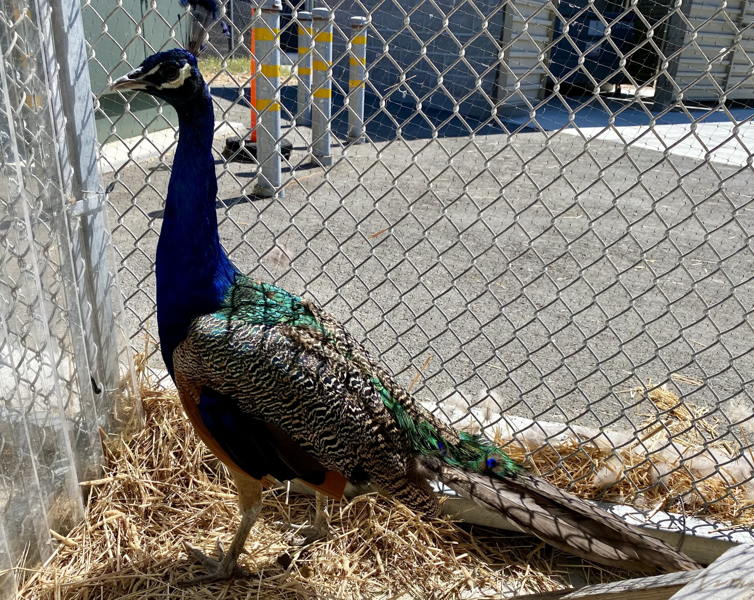 "Our rescue staff arrived and saw the bird darting around the lot," said Martin-Tarbox. "Peafowl are very smart birds and can be difficult to catch, but after about 20 minutes our staff was able to safely net the bird and bring him back to our shelter in San Mateo."